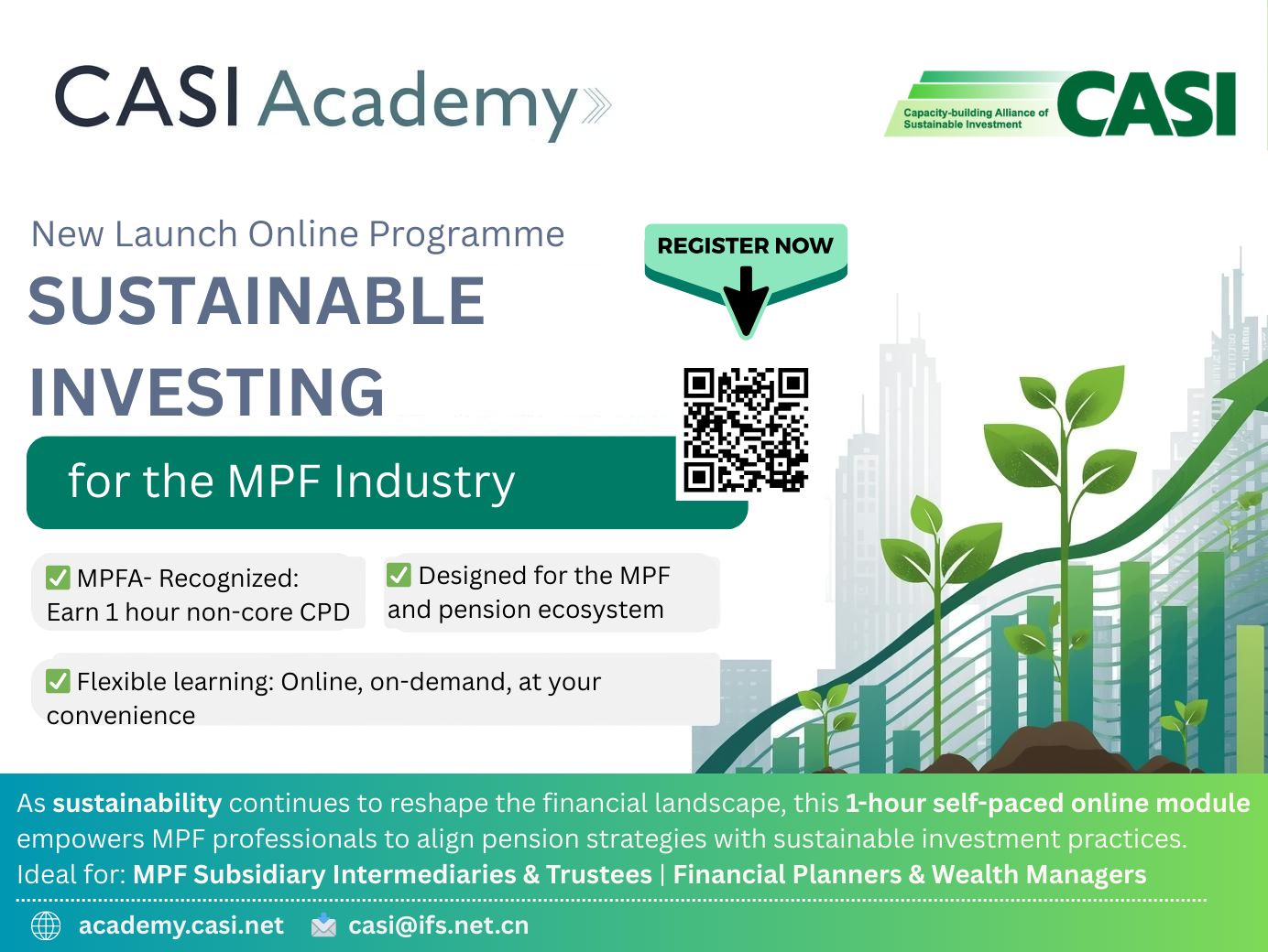 Hong Kong December 18 2025 - CASI Academy announces the launch of the “CASI Academy Special Program: Sustainable Investing for the MPF Industry,” a one-hour, self-paced online course designed specifically for Hong Kong MPF subsidiary intermediaries, trustees, financial planners, and wealth managers. Delivered in English, the program aims to strengthen professional knowledge of participants in sustainable investing to support clear communication with MPF scheme members. The program qualifies for one hour of non-core Continuing Professional Development (CPD) for subsidiary intermediaries.