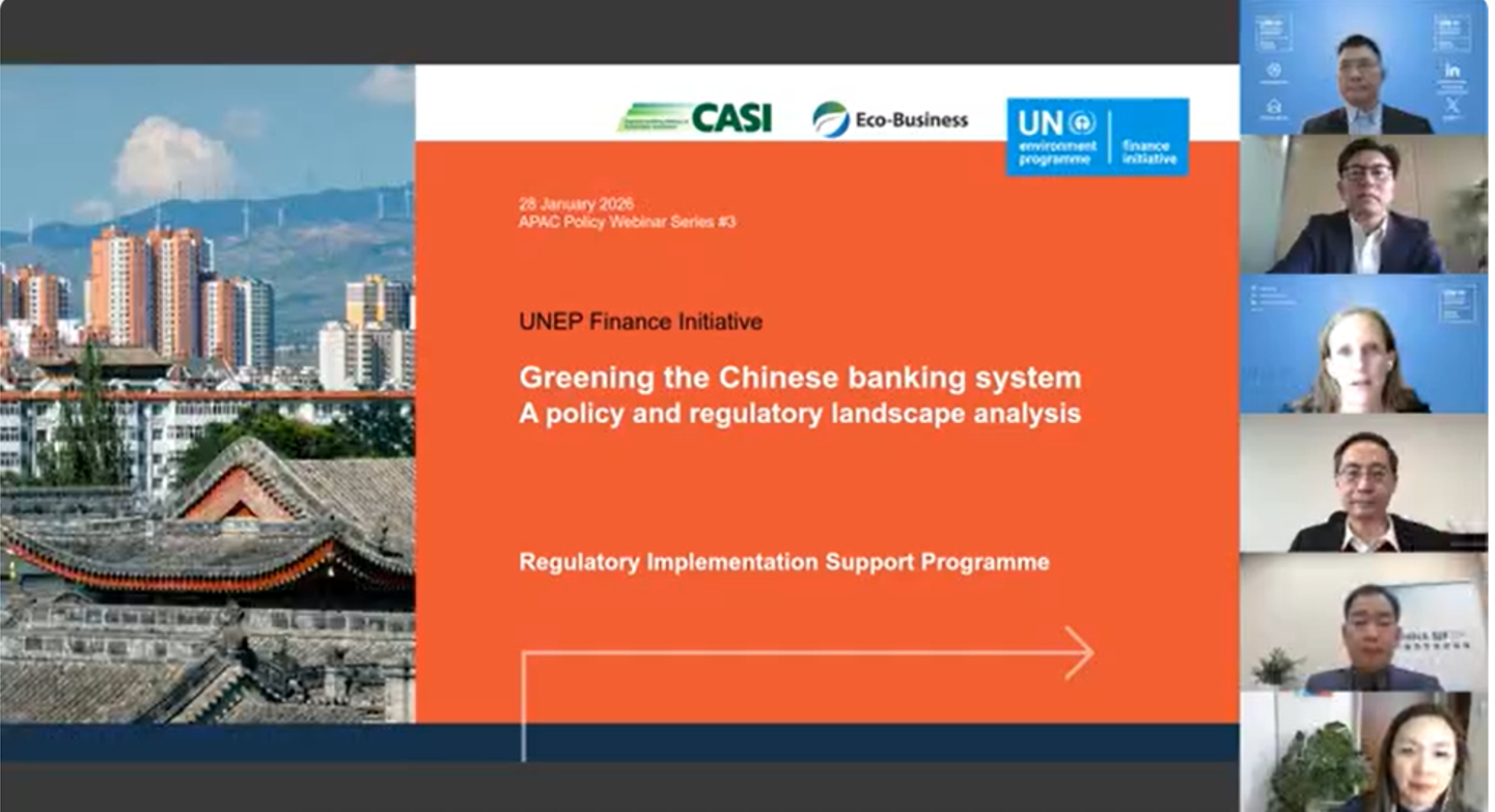 CASI was pleased to co-host, together with United Nations Environment Programme Finance Initiative (UNEP FI) and Eco-Business, the webinar marking the launch of UNEP FI’s third Asia-Pacific Policy Brief, Greening China’s Banking Sector, delivered under the Regulatory Implementation Support Programme (RISK). The session convened regulators, financial institutions, academia, and civil society to examine how regulatory, policy, and market-based tools have been used to steer banking activity toward environmental and climate objectives, and how these experiences can inform international discussions in an increasingly complex global context.